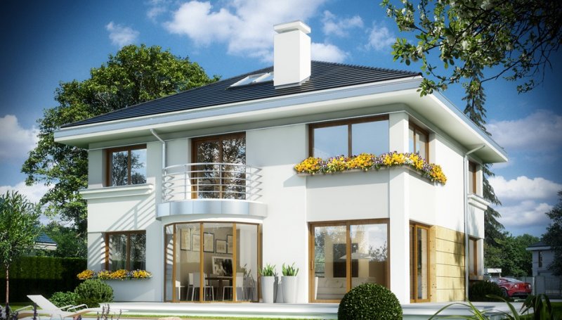 Проект "Жеховский " - хороший двухэтажный дом для постоянного жилья из газоблока с балконом, с гаражом, с террасой, с баней. Площадь строения 186.38 кв.м. с размерами 11*11.