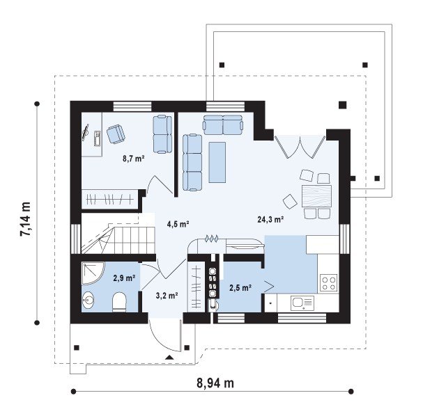 Проект "Вега" - прекрасный двухэтажный дом для постоянного жилья из газоблока с террасой. Площадь строения 78.1 кв.м. с размерами 8*7.
