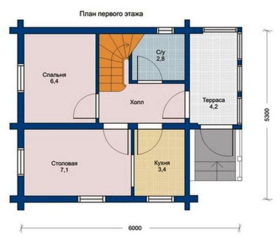 Проект "Проект ОБД-8" - красивый одноэтажный дом для постоянного проживания из оцилиндрованного бревна с балконом, с террасой. Площадь дома 39.34 кв.м. с размерами 6x5.