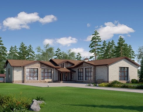 Проект "Антигона" - отличный одноэтажный дом для постоянного проживания из кирпича с террасой, с бассейном. Площадь строения 401.44 кв.м. с размерами 17*17.
