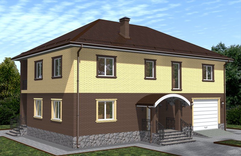 Проект "Росс" - идеальный двухэтажный дом для постоянного жилья из керамических блоков с балконом, с гаражом, с террасой. Площадь строения 243.56 кв.м. с размерами 16x12.