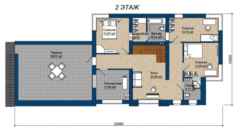 Проект "Петуния " - прекрасный двухэтажный дом для постоянного проживания из керамических блоков с гаражом, с террасой. Площадь строения 252 кв.м. с размерами 23 на 10.