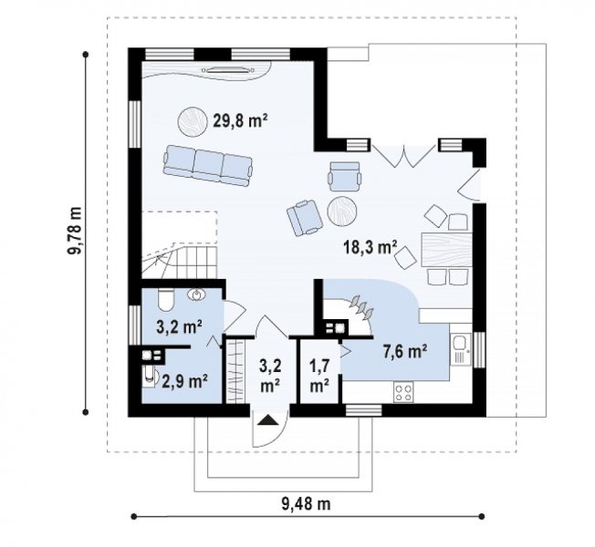 Проект "Джеральдина " - хороший одноэтажный дом для постоянного жилья из кирпича с балконом. Площадь строения 116.9 кв.м. с размерами 9x9.