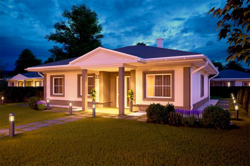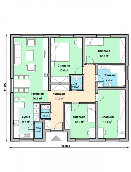 Проект "Кордула " - отличный одноэтажный дом для постоянного проживания из кирпича. Площадь строения 115.5 кв.м. с размерами 12 на 11.