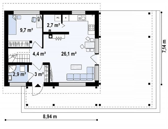 Проект "Шанталь " - красивый одноэтажный дом для постоянного проживания из кирпича с террасой. Площадь дома 77.1 кв.м. с размерами 8 на 7.