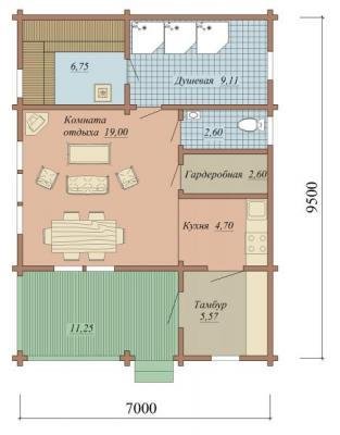 Проект "Проект БД-117" - прекрасный одноэтажный дом для постоянного проживания из профилированного бруса с террасой. Площадь строения 61.58 кв.м. с размерами 7*9.