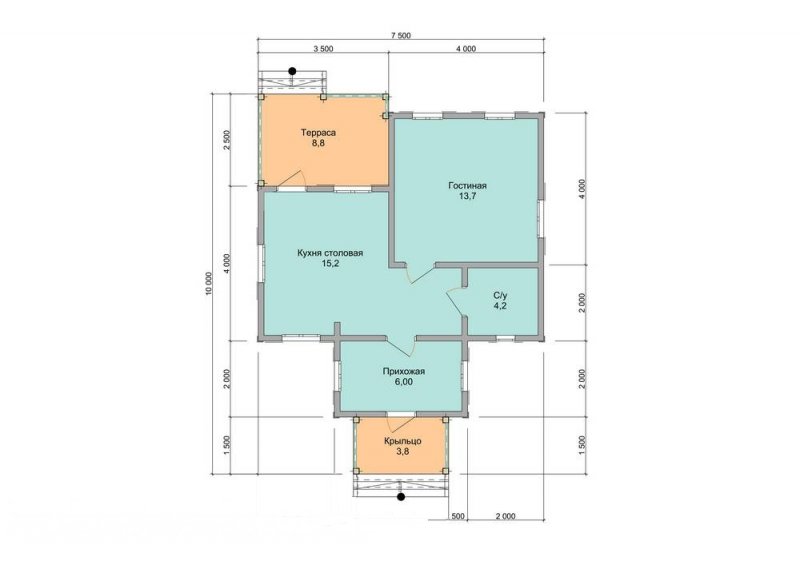 Проект "Шлютия " - прекрасный одноэтажный дом для постоянного проживания из профилированного бруса с террасой. Площадь строения 47.9 кв.м. с размерами 7*10.
