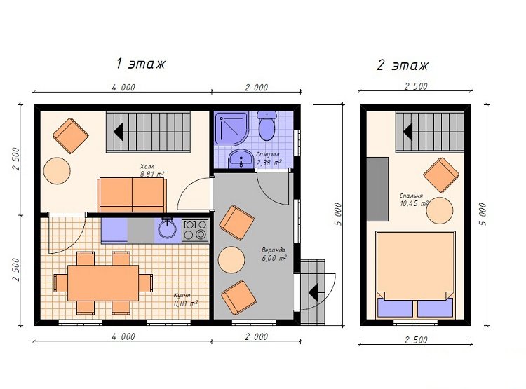 Проект "Сирена" - прекрасный двухэтажный дом для постоянного проживания из профилированного бруса с верандой. Площадь строения 36.45 кв.м. с размерами 5x6.