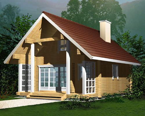 Проект "Юкунда " - хороший двухэтажный дом для постоянного проживания из профилированного бруса с террасой, с баней. Площадь строения 46.92 кв.м. с размерами 5x7.
